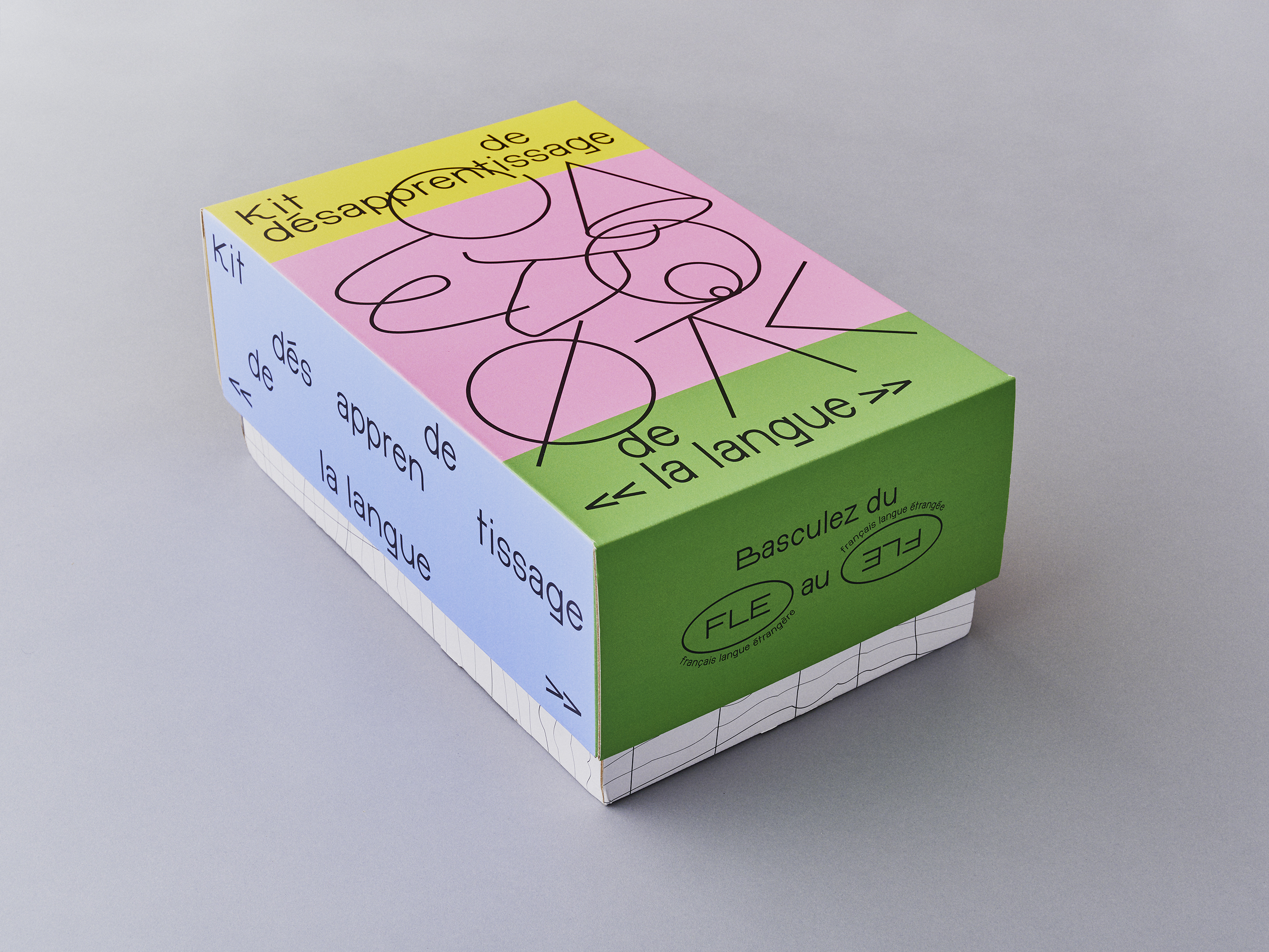 Le kit de désapprentissage de "la langue" a été rêvé par Myriam Suchet et conçu puis réalisé en complicité avec les Tables des Matières (Alice Ferré et Elise Gabriel) au design et Pierre Tandille pour le graphisme. Il se destine en priorité aux personnes formées à enseigner le FLE, mais pas que ! Il s'agit d'un jeu qui n'a pas de règles et s'invente à chaque activation. L'activer, c'est éprouver "la langue" comme mouvement, relation, création continue. Le kit se présente comme un anti-manuel sous la forme d'une boite composée d'énigmes à activer, dont le tirage est limité à 25 exemplaires, réalisés à la main. Le prix de fabrication est de 650 euros par kit... L'idée étant qu'il circule essentiellement dans les endroits dépourvus de moyens, il n'est pas vendu mais proposé en adoption sur engagement.